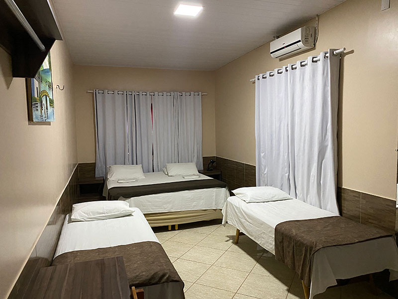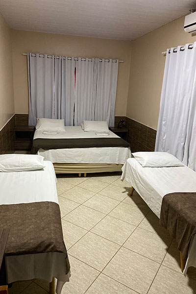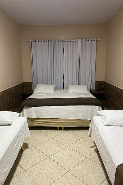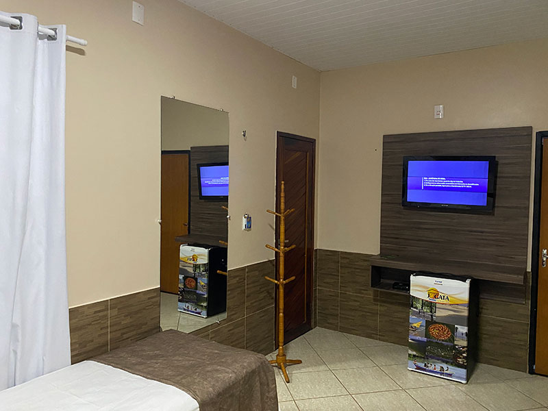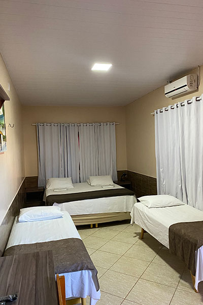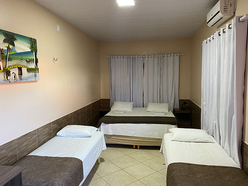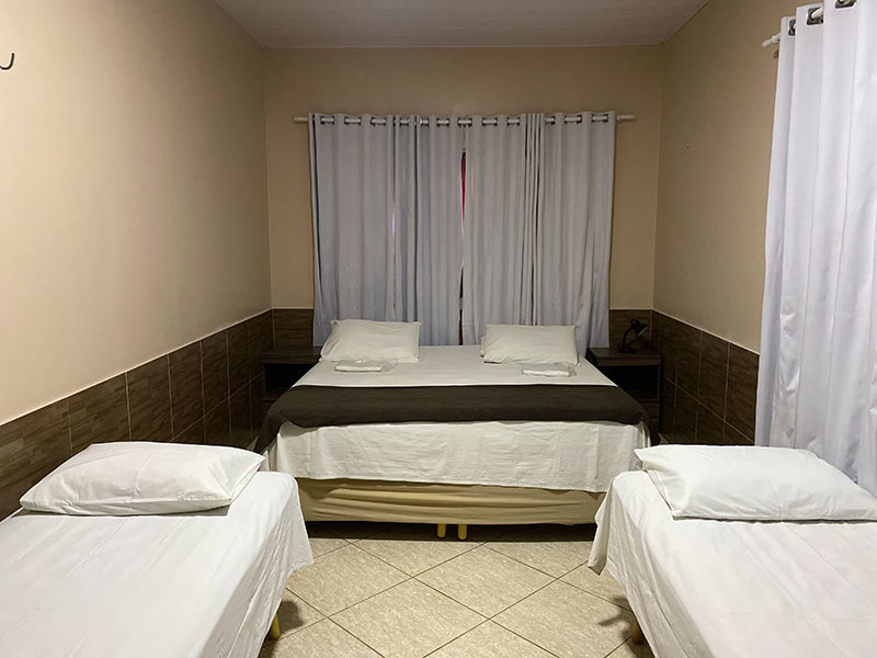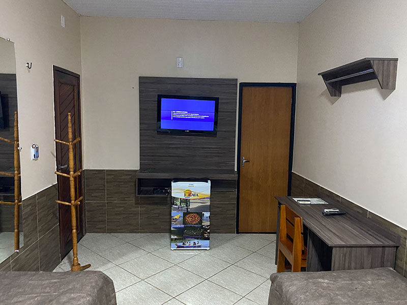 Apartamento no corredor de traz, 01 Cama de casal Box King ou 2 Camas articuladas solteira(cama extra), Ar Split, TV de LED 32", Frigobar(vazio), Secador de cabelo e Banheiro privativo com ducha de aquecimento solar.