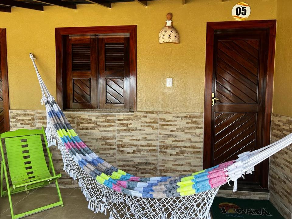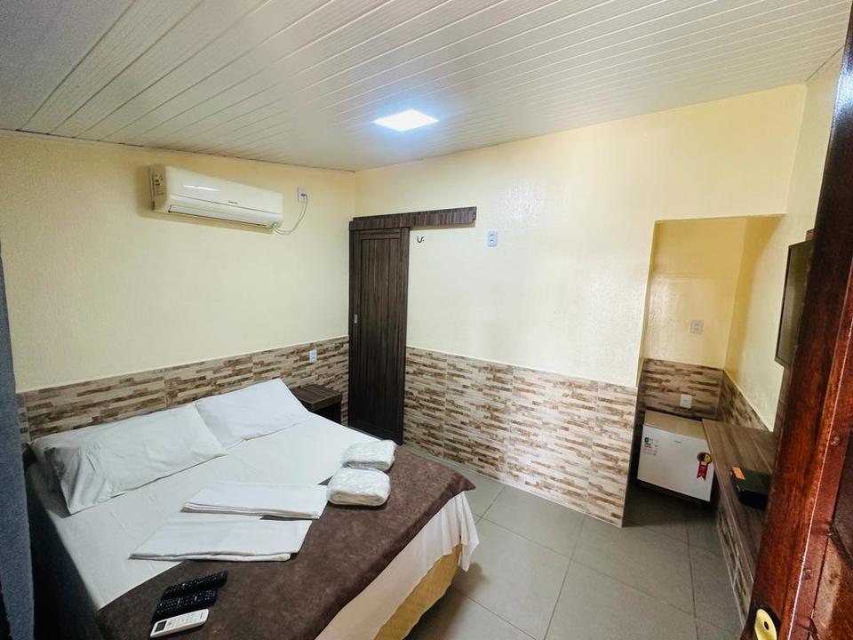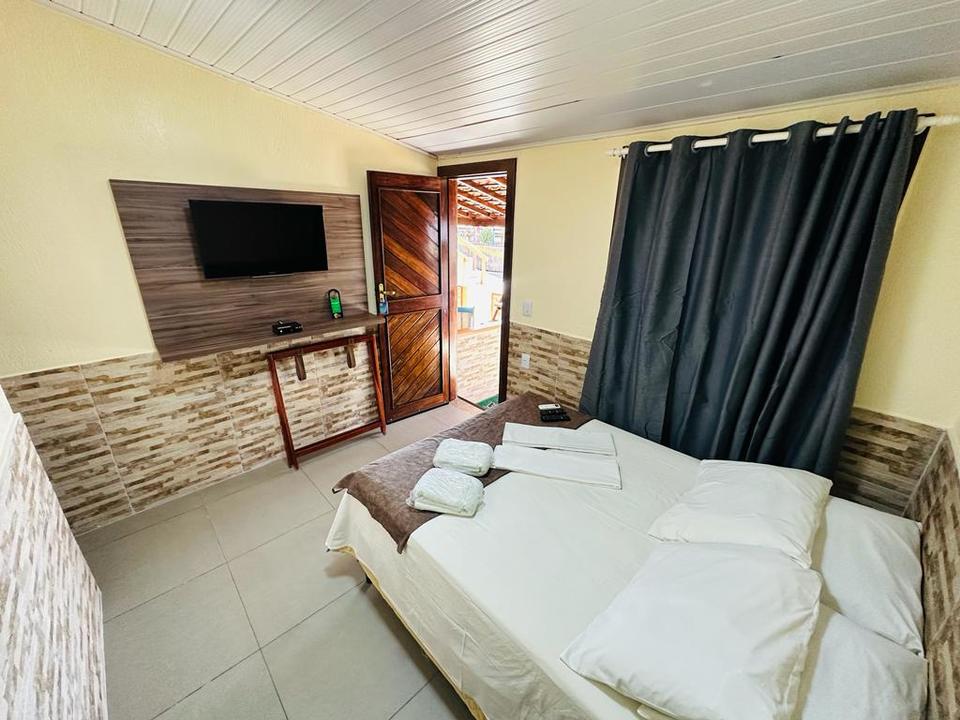 Cama de casal(alvenaria tamanho padrão), Ar Split, TV de LED 32", Frigobar(vazio), Secador de cabelo e Banheiro privativo com ducha de aquecimento solar.
